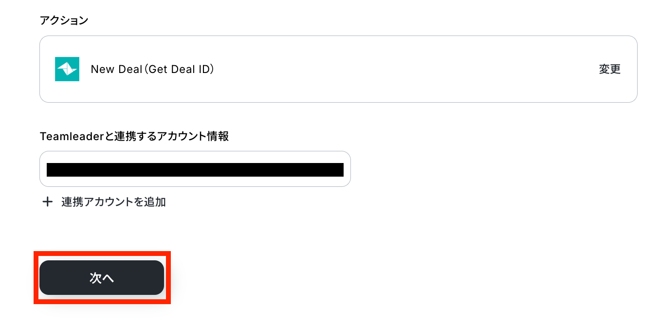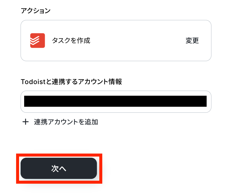 アクションはそのままで、Todoistと連携するアカウント情報を確認します。