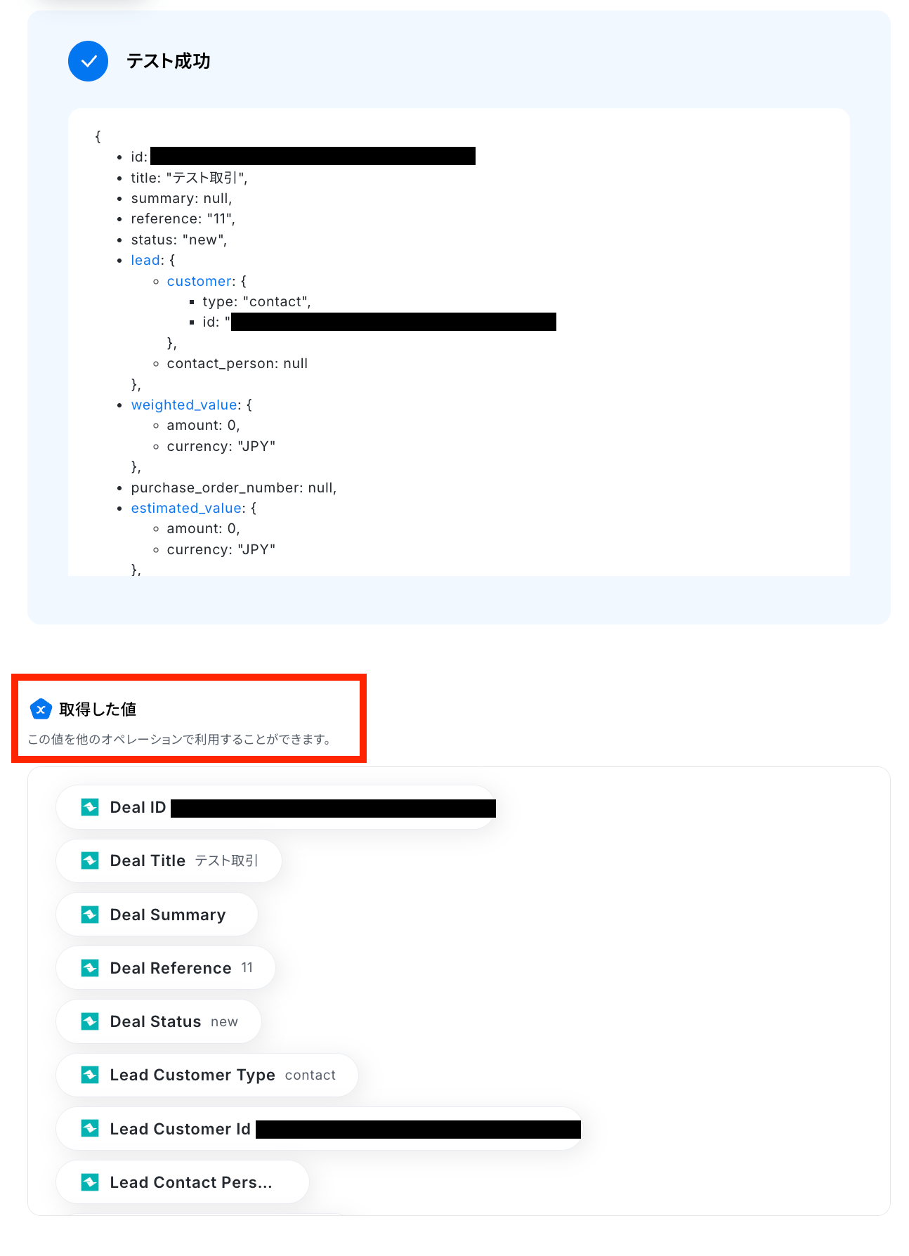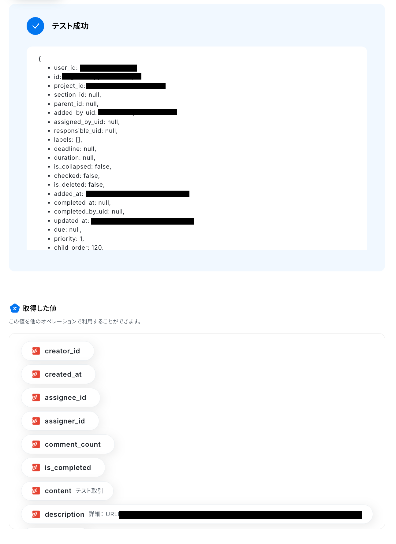 「テスト成功」と表示が出たら、取得した値が取得されます。