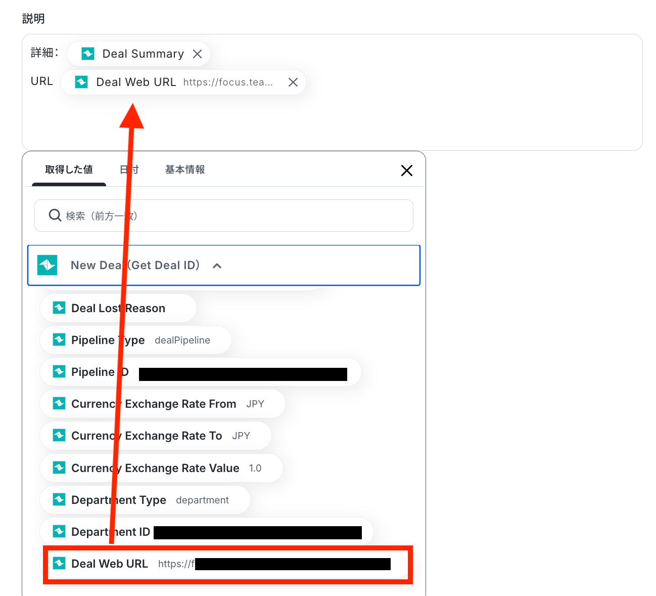 - Todoistでタスクを作成するアクションでは、トリガーで取得したTeamleaderのディール情報を引用し、タスクのタイトルや内容などの各項目を自由に設定できます。