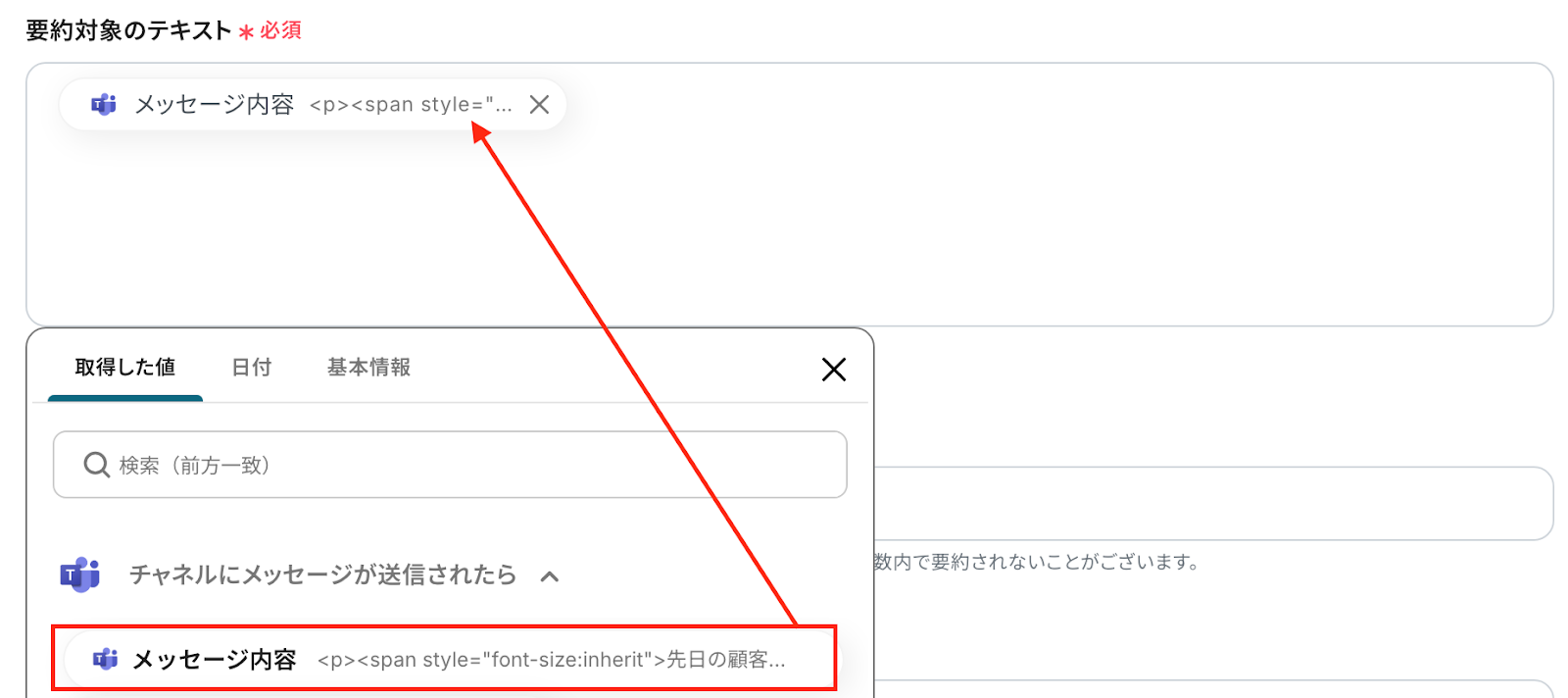 続いて、詳細設定をしましょう。 ここでは、先ほど取得したアウトプットを要約したり、プロンプトをカスタマイズしたりすることができます。 「要約対象のテキスト」では、入力欄をクリックして表示されるアウトプットから選択して設定してください。