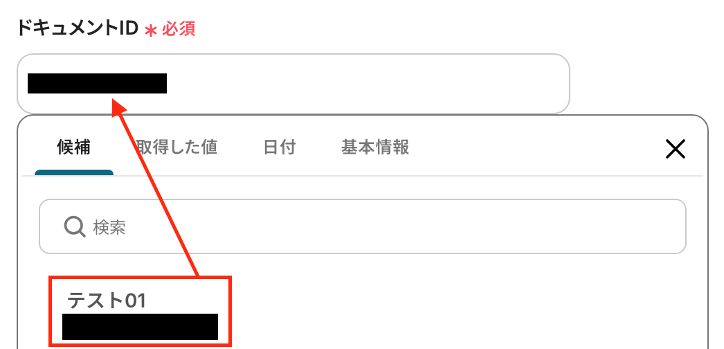 「ドキュメントID」 に対象のドキュメントのIDを入力します。 「候補」から連携したアカウント内にあるドキュメントのリストが表示されるので、対象のドキュメントをクリックしましょう。