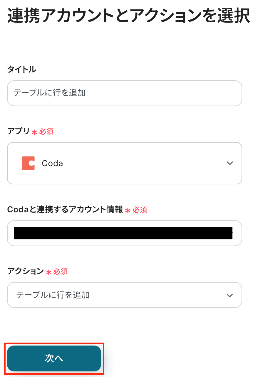 タイトルを任意で修正し、連携するアカウントを確認します。アクションはそのままでOKです!