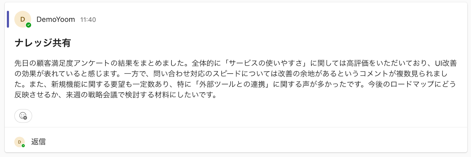 この連携では、Microsoft Teamsに投稿された内容をAIが自動で要約し、その結果をCodaのテーブルにナレッジとして蓄積するため、情報整理の手間を削減し、重要な議論のポイントの効率的な共有 に繋がります。