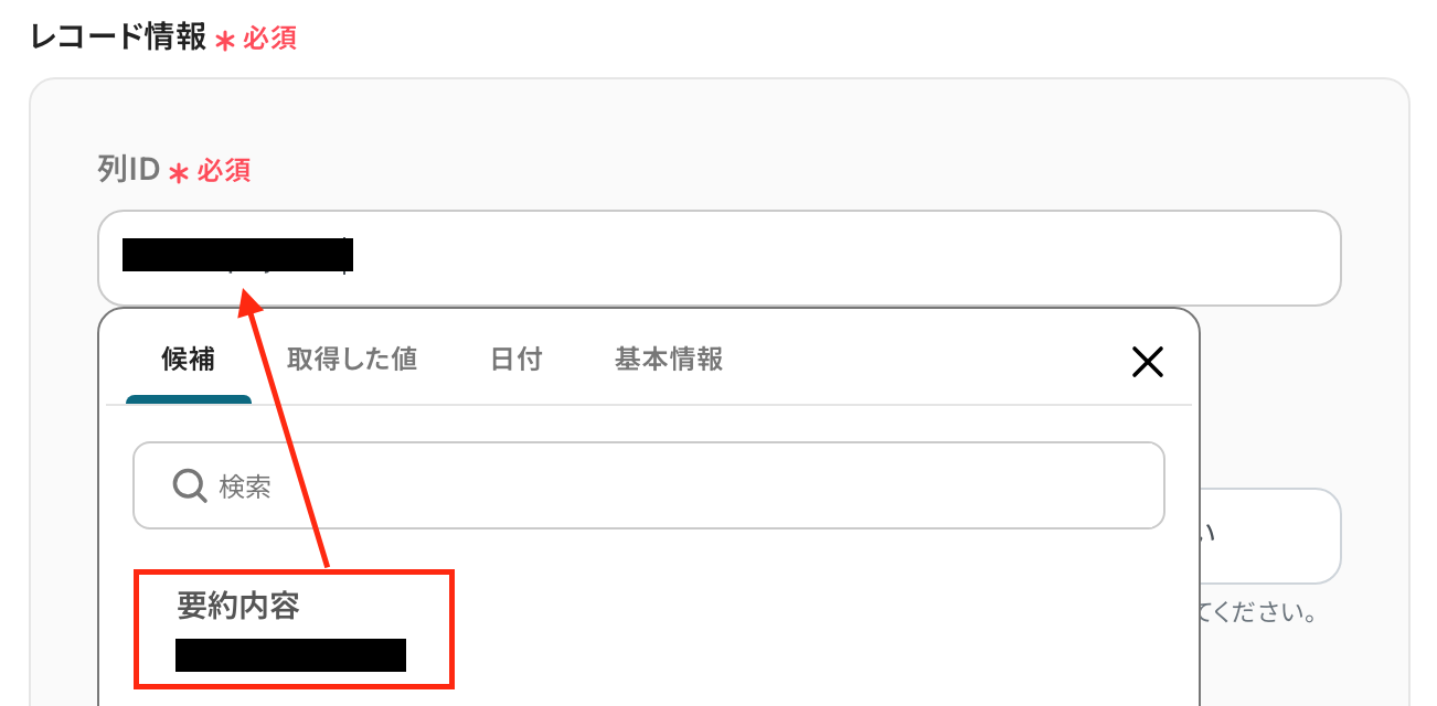 「列ID」 :入力欄をクリックして表示される候補から選択。