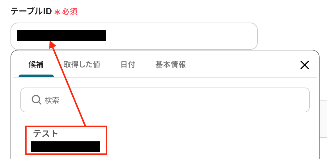 続いて、「テーブルID」 を設定します。 入力欄をクリックして表示される候補から選択しましょう。