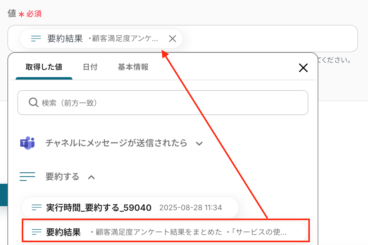 「値」 :入力欄をクリックして表示されるアウトプットを引用して設定。固定値を登録したい場合は、直接入力してください。
