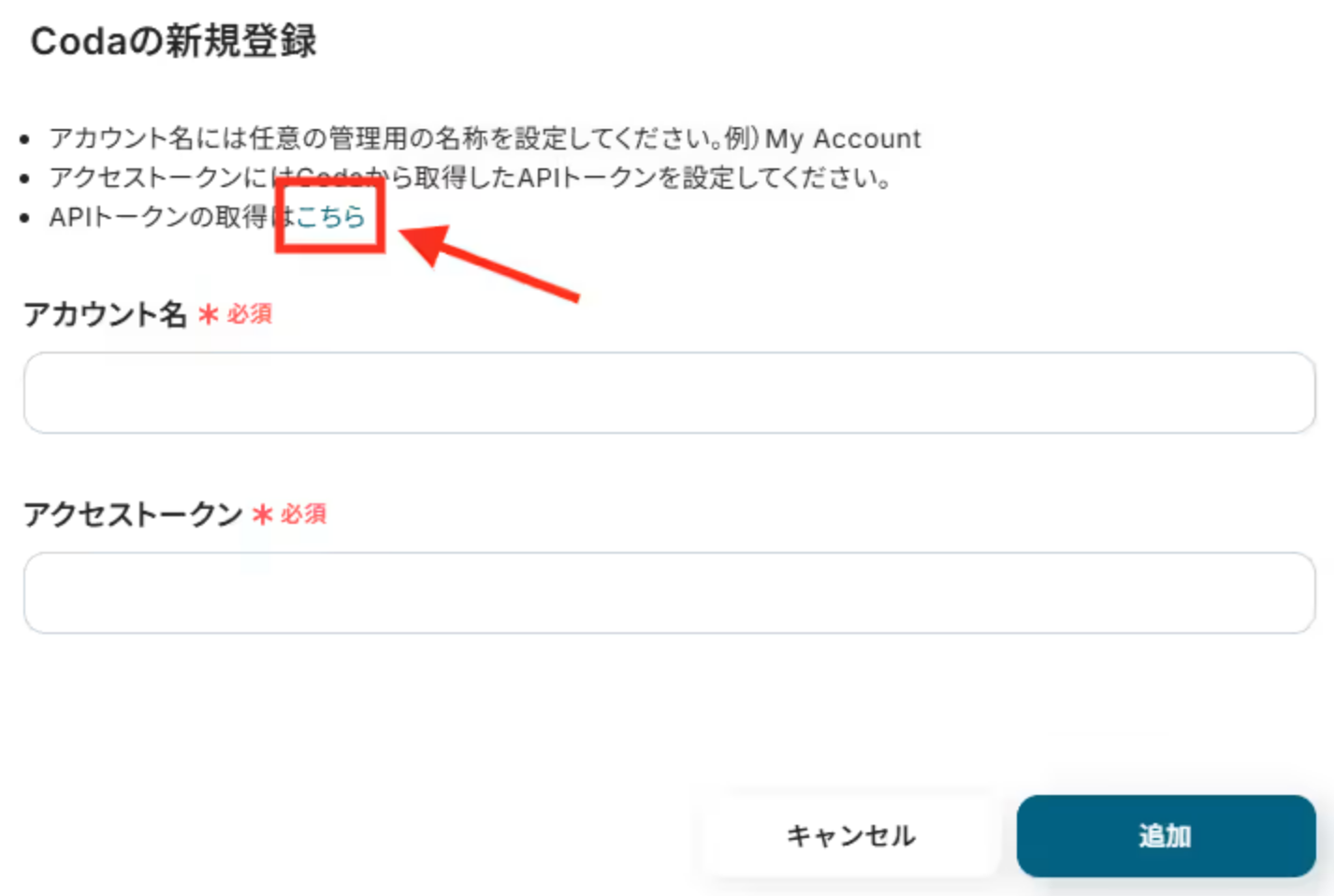 以下の画面が表示されたら、任意の「アカウント名」を入力しましょう。 「アクセストークン」は赤矢印のこちら をクリックして、CodaのAPIトークンを取得してください。