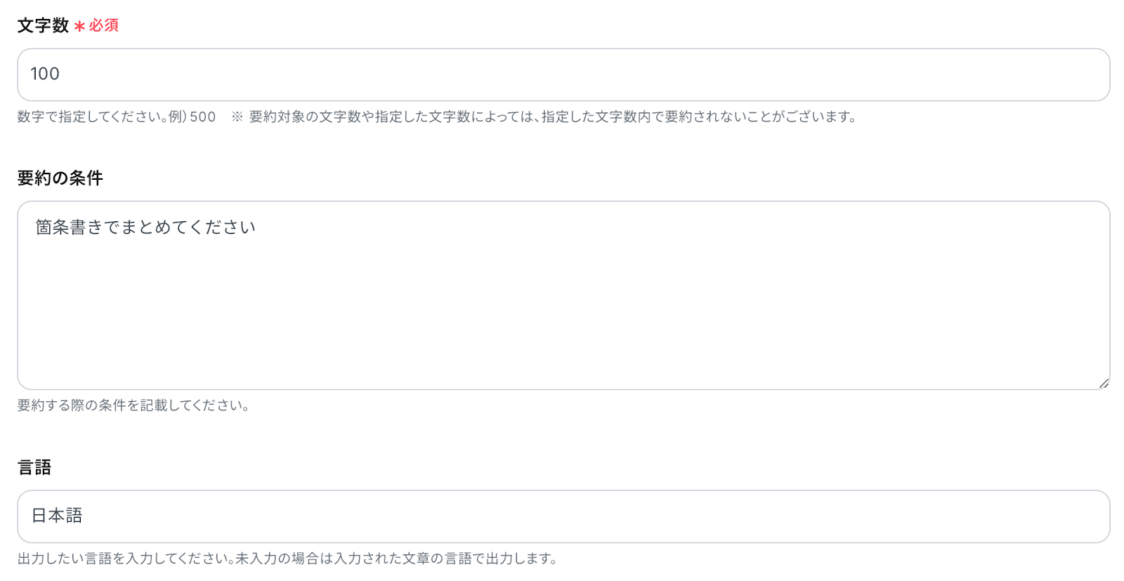 続いて、文字数・要約条件・言語を設定しましょう。 要約の条件は、「簡潔に箇条書きでまとめてください」など任意で設定してください。 各項目の設定が完了したら、「テスト」をクリックします。