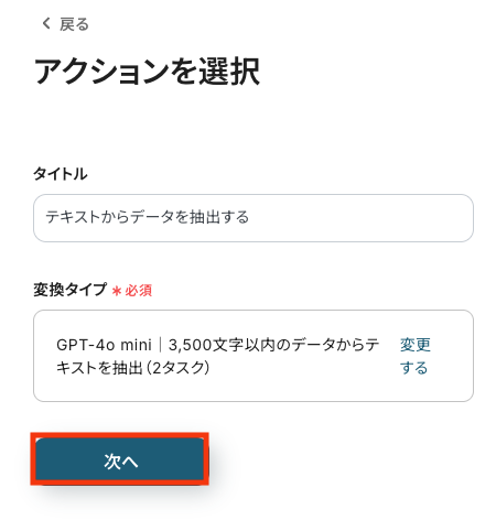 今回は変換タイプ(GPT-4o mini|3,500文字以内のデータからテキストを抽出(2タスク)を選択していますが必要に応じて選択しましょう。