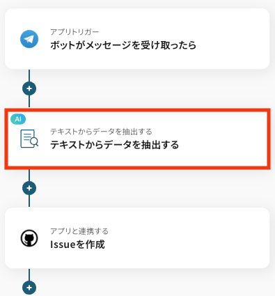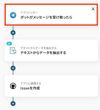「#issue」や「#タスク」といった特定のハッシュタグやキーワードが含まれるTelegramメッセージが投稿された場合にのみ、GitHubのIssueを自動で作成するフローです。