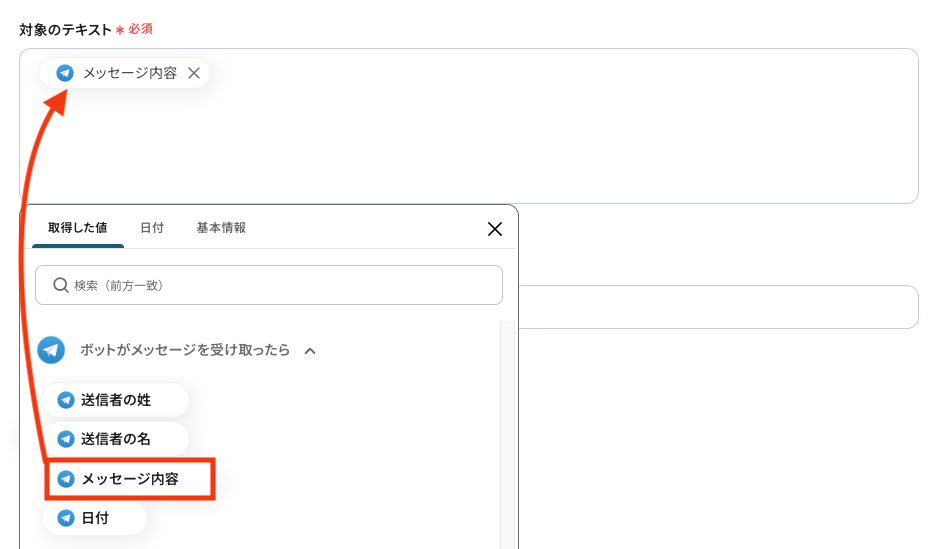 Telegramでボットが受け取ったメッセージから、抽出対象となるテキストを設定します。