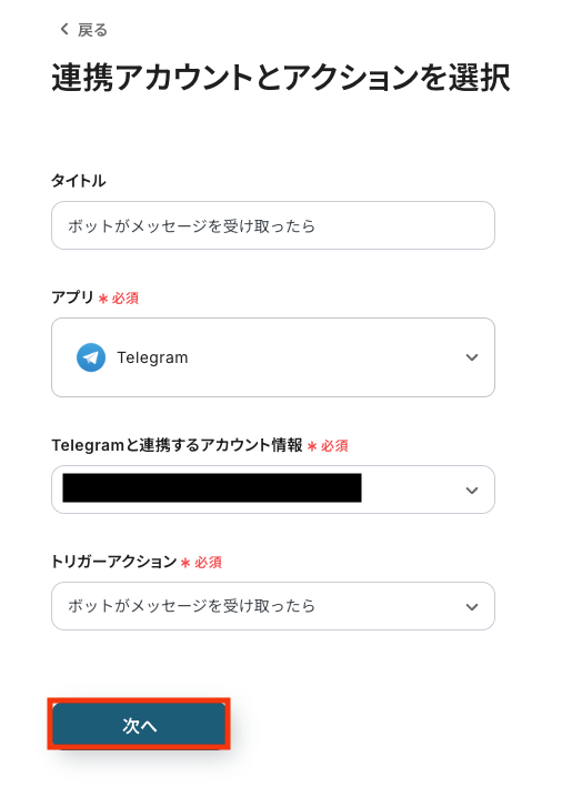 Telegramと連携するアカウント情報に問題がなければ、「次へ」をクリックします。