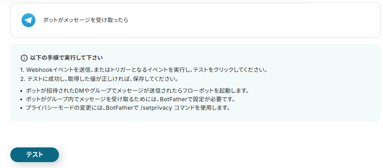 Telegramのボットがメッセージを受け取ったときに、自動処理が正しく起動するか確認するため、「テスト」をクリックします。