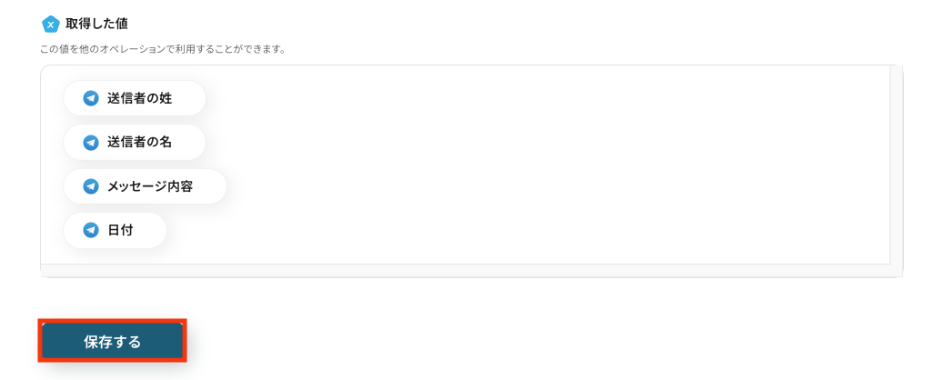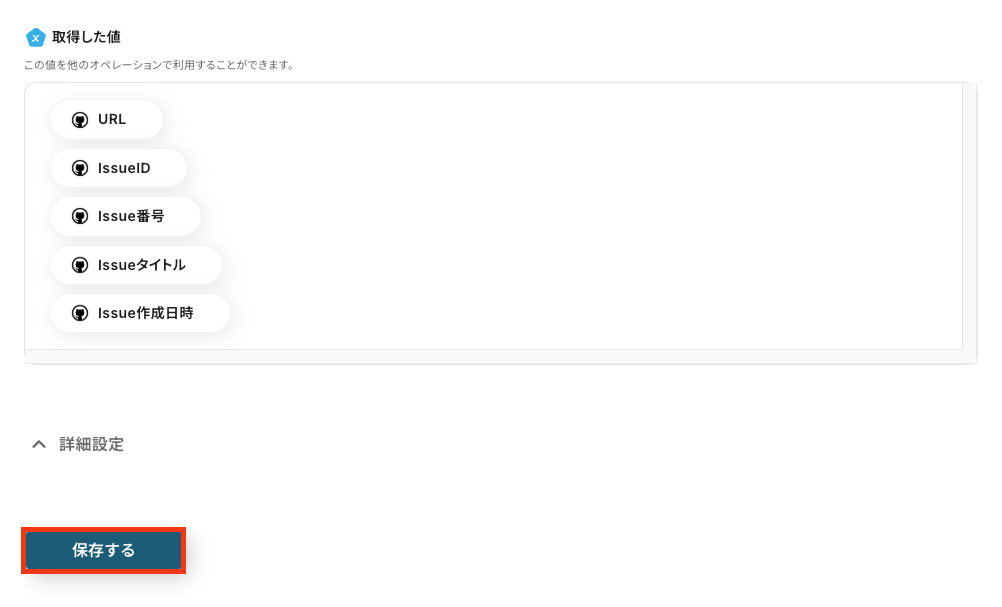 問題がなければ取得した値を確認し、「保存する」をクリックします。