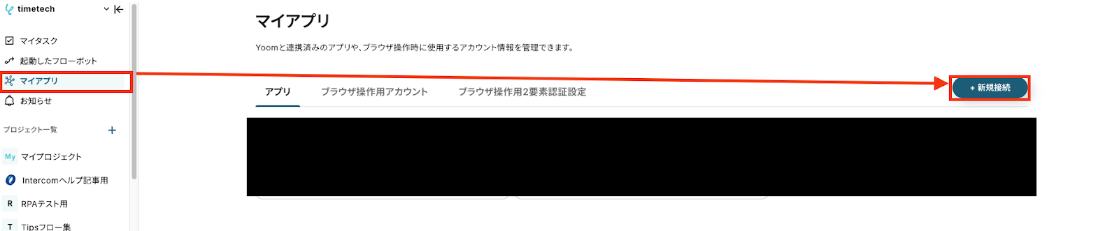 Yoomにログインしたあと左メニューにあるマイアプリを押し、右の新規接続というボタンを押します。