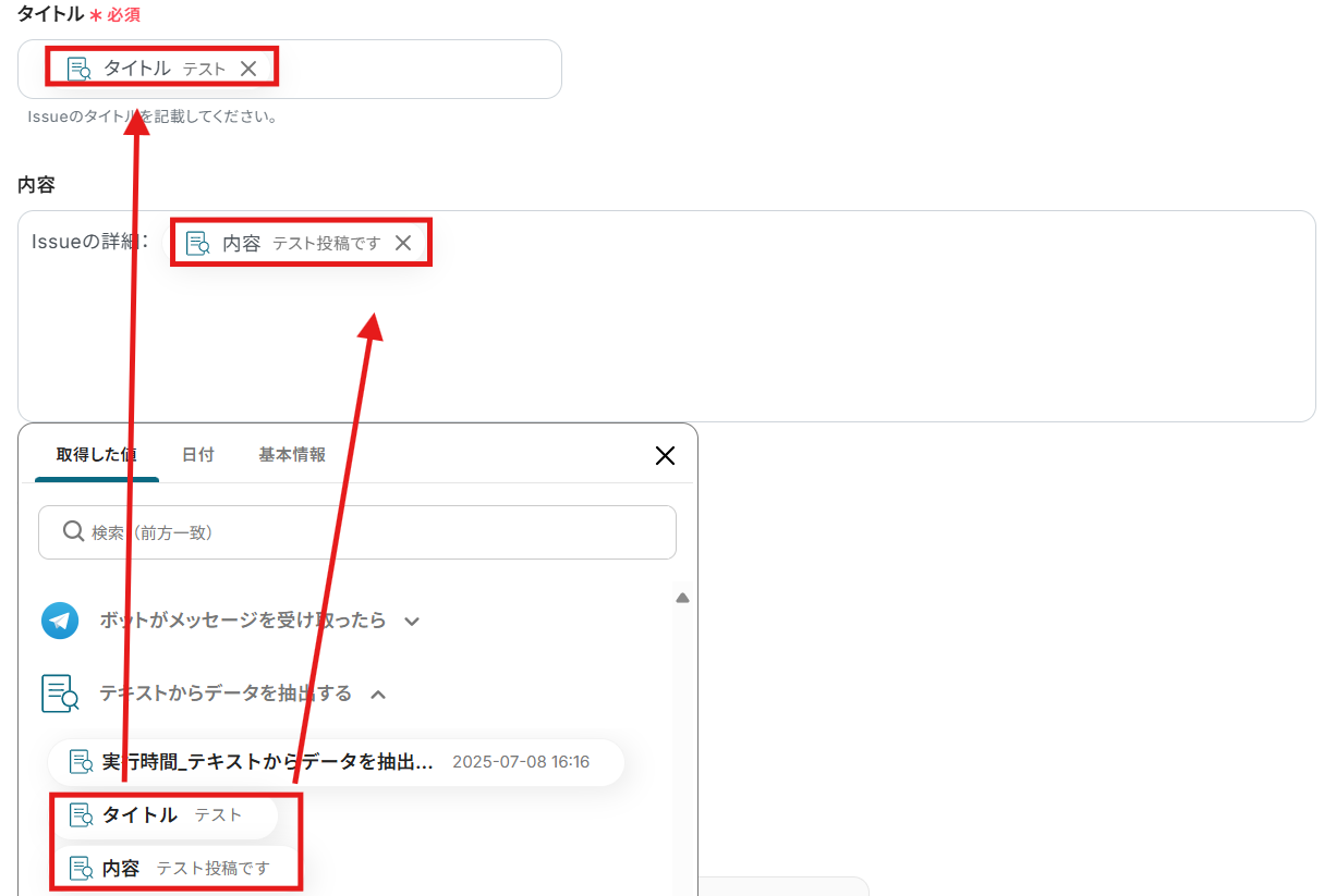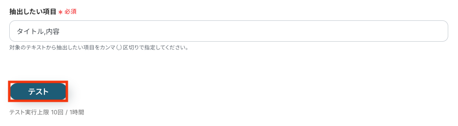 入力が完了したら、設定した項目が実際にメッセージから正しく抽出されるかどうかを確認するため「テスト」をクリックします。