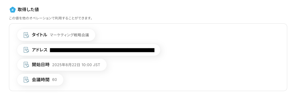 テストが成功すると、以下のように「取得した値 」が表示されます。 ※「取得した値(=アウトプット)」は、後のフローで使用します。
