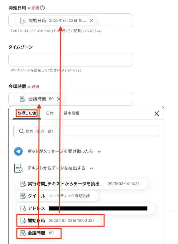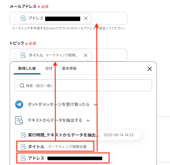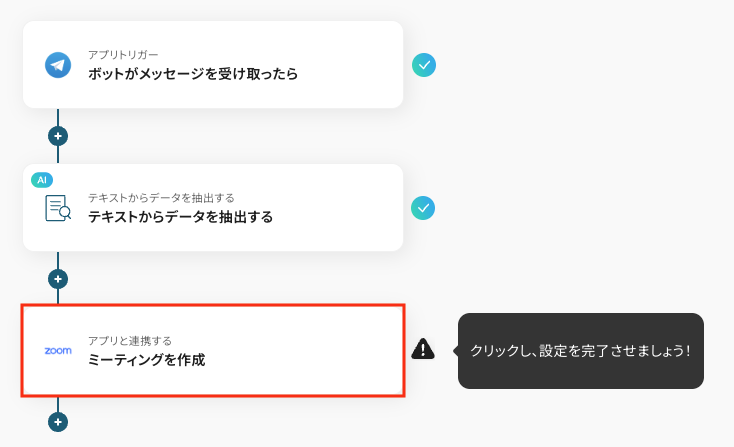 Telegramから抽出したテキストを使い、Zoomミーティングを作成するための設定をします。 最後のオペレーションにある、「ミーティングを作成」をクリックしてください。