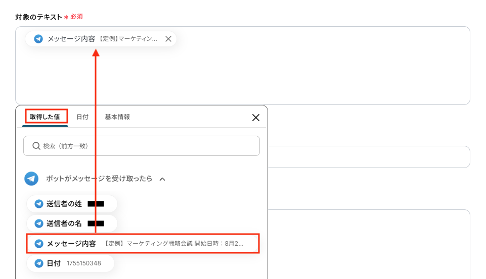 次に、詳細を設定 へ進みます。 以下を参考に、「対象のテキスト」を取得した値から選択してください。 ※取得した値を使用することで、値が固定化されず、毎回最新の情報からテキストを抽出できます。