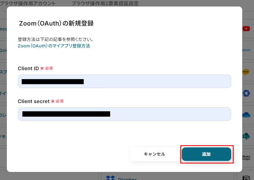 次は、Zoomとの連携です。 Zoomを検索・選択後、Client IDとClient secretを入力し、「追加」をクリックすると、マイアプリ登録が完了します。 ※Zoomの連携については、Zoom(OAuth)のマイアプリ登録方法 をご覧ください。 ※Zoomのプランによって利用可能なアクションが異なるため、あらかじめご注意ください。