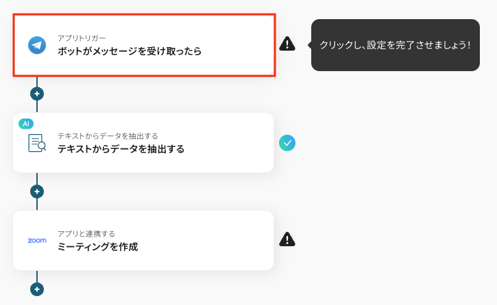 今回は「Telegramで投稿があったら、Zoomでミーティングを作成する」フローを作成していきます!作成の流れは大きく分けて以下の通りです。