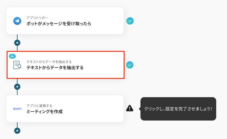 Telegramのメッセージから、Zoomミーティングの作成に必要なテキストの抽出設定をします。 二つ目のオペレーションにある、「テキストからデータを抽出する」をクリックしてください。