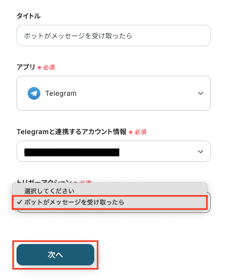 続いて、連携アカウントとアクションを選択 に進みます。各項目の確認・入力をし、次に進みましょう!