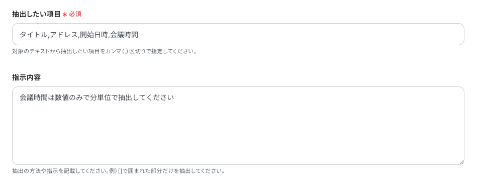 「抽出したい項目」は、手動で入力します。 ※「指示内容」は、必要に応じて入力してください。