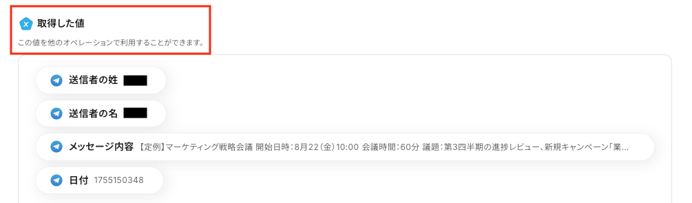 A:設定可能です。ただし、件名や説明文を手動で入力した場合は、同じ内容が繰り返し設定されてしまうため、Telegramから取得した値(=アウトプット) をご利用ください。