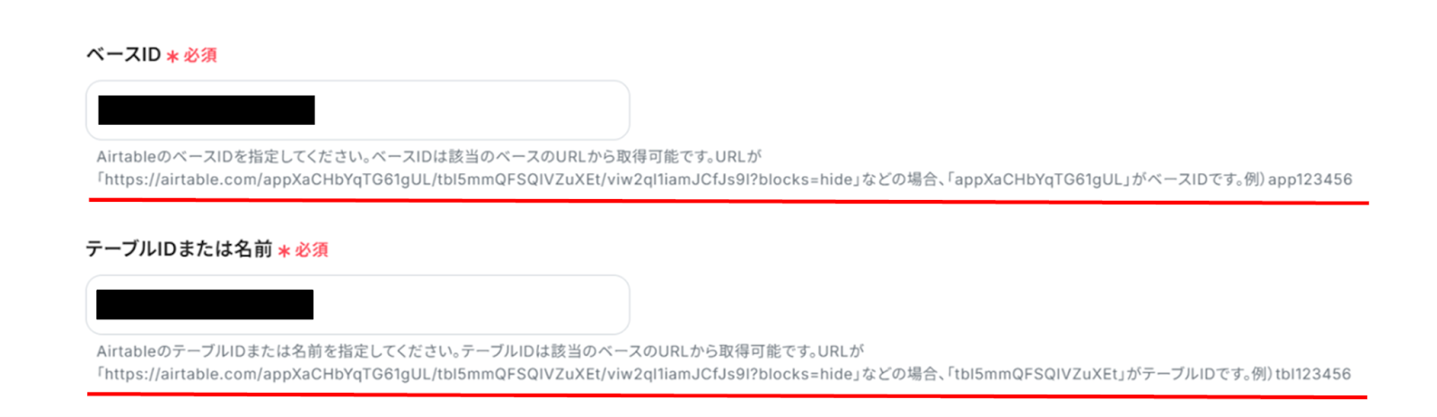 (3)「API接続設定」画面から赤線を確認の上、ベースID、テーブルIDまたは名前を入力します。