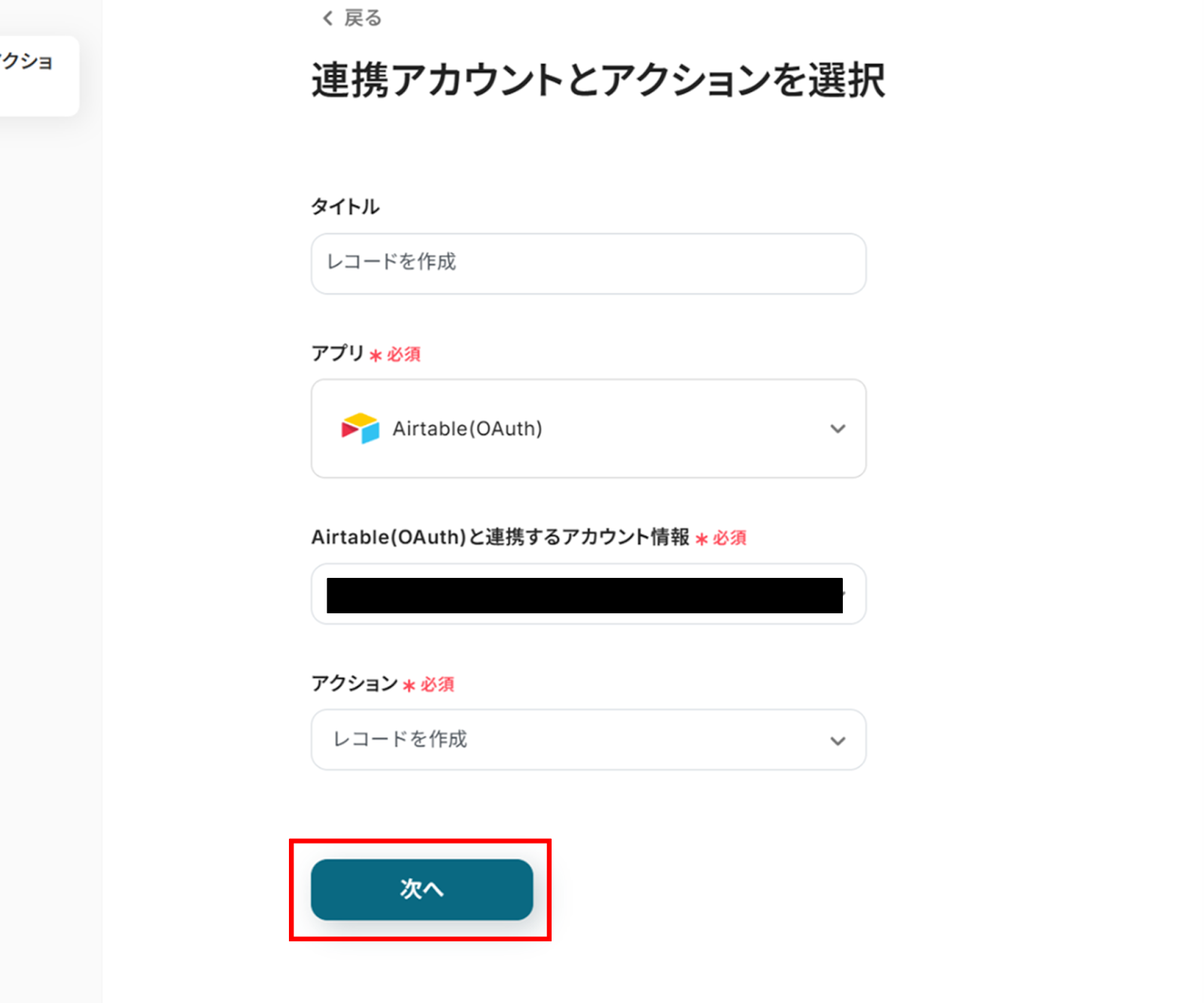 (2)「連携アカウントとアクションを選択」画面から、Airtableと連携するアカウント情報に誤りがないかを確認し、アクションは「レコードを作成」のままで「次へ」をクリックします。
