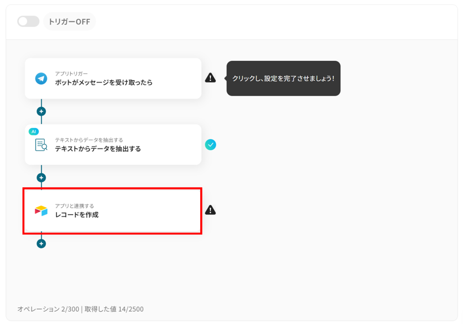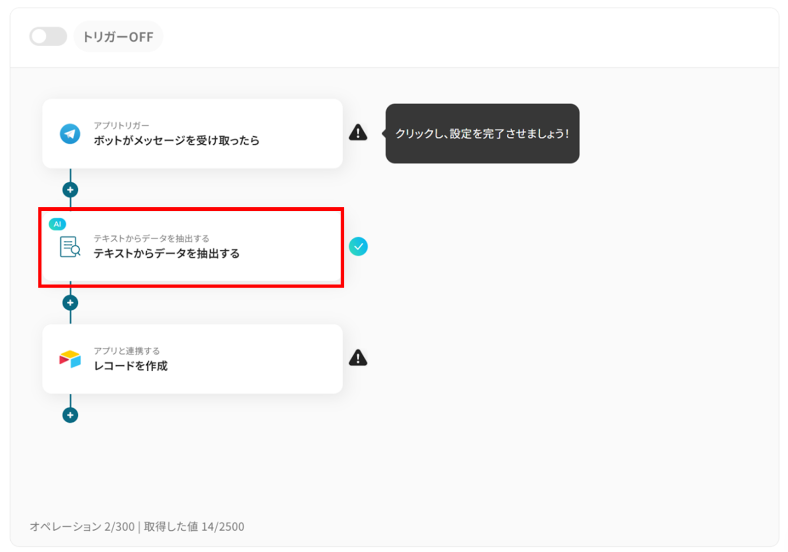 - アプリトリガー、テキストデータを抽出する、Airtableでレコードを作成する設定