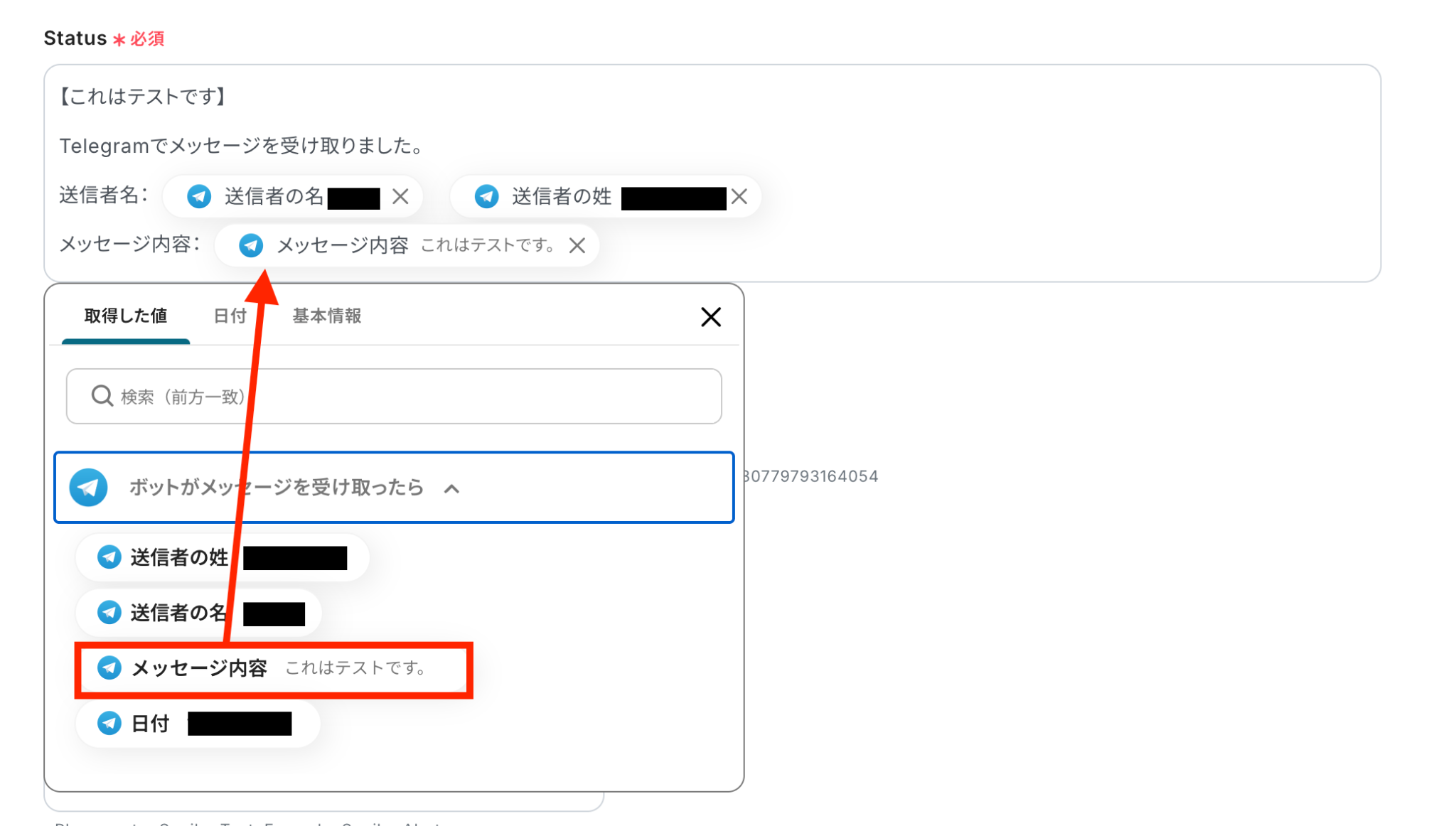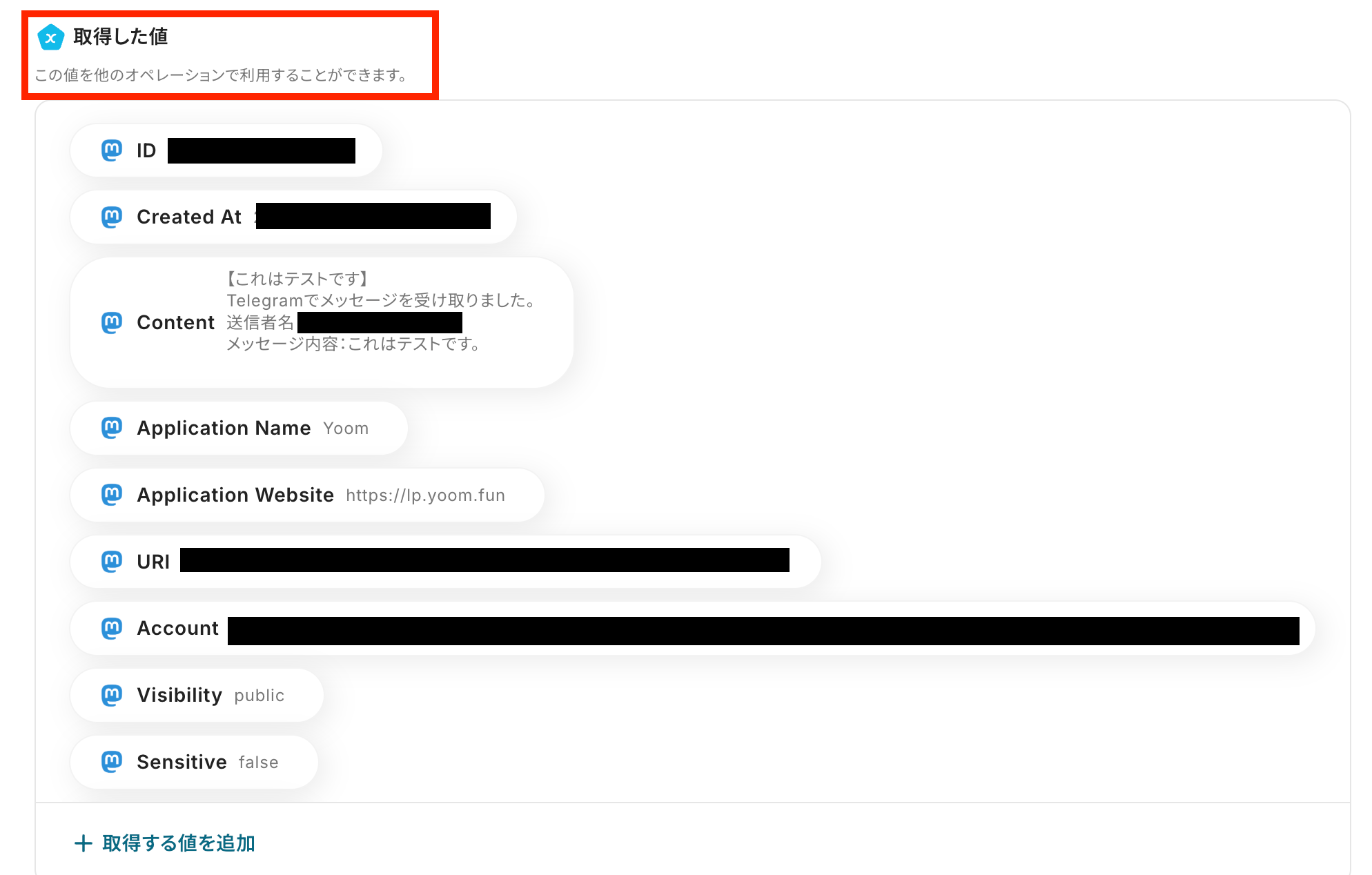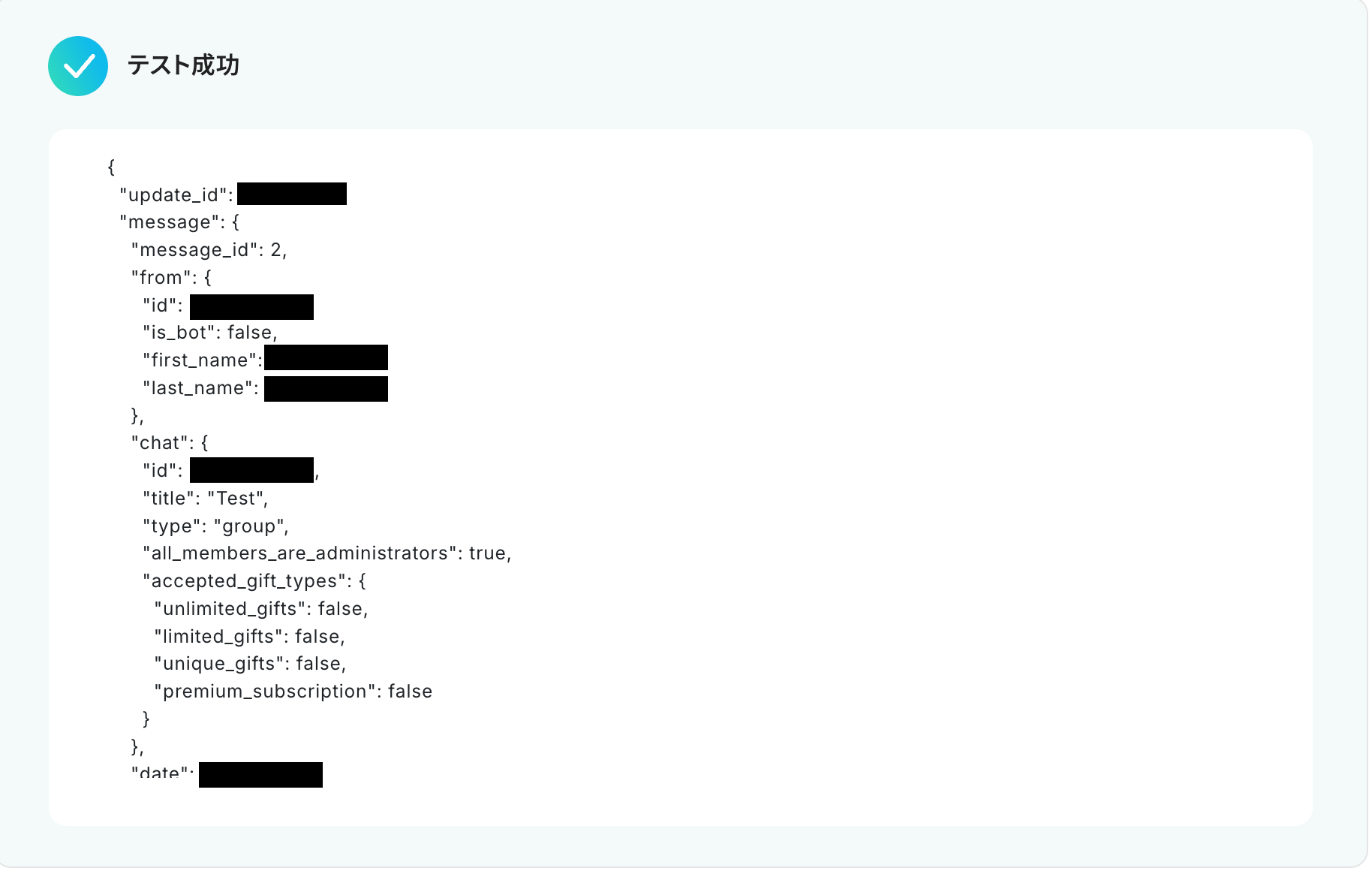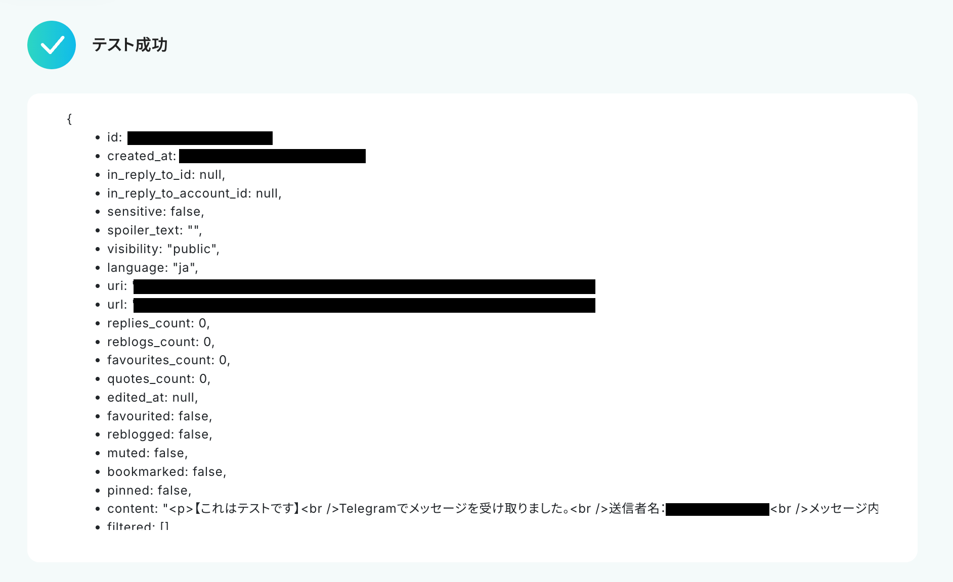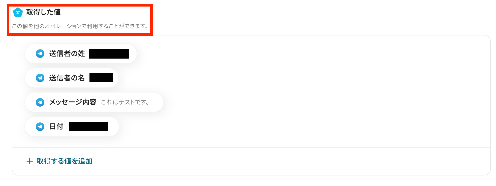 「テスト成功」と表示が出たら、取得した値にTelegramの情報が表示されます。