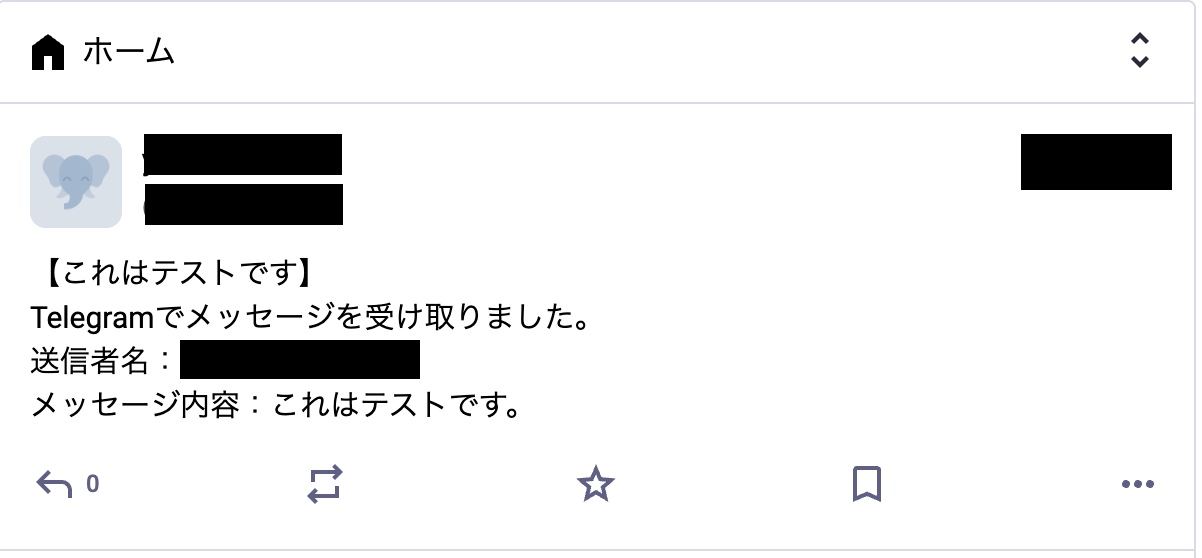 そのため、Telegramでメッセージを受信してからMastodonに投稿されるまでのタイムラグはなく、リアルタイムで連携が実行されます。