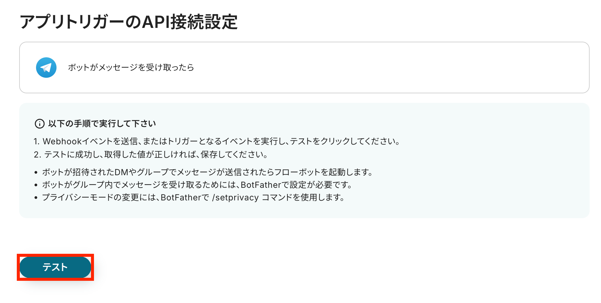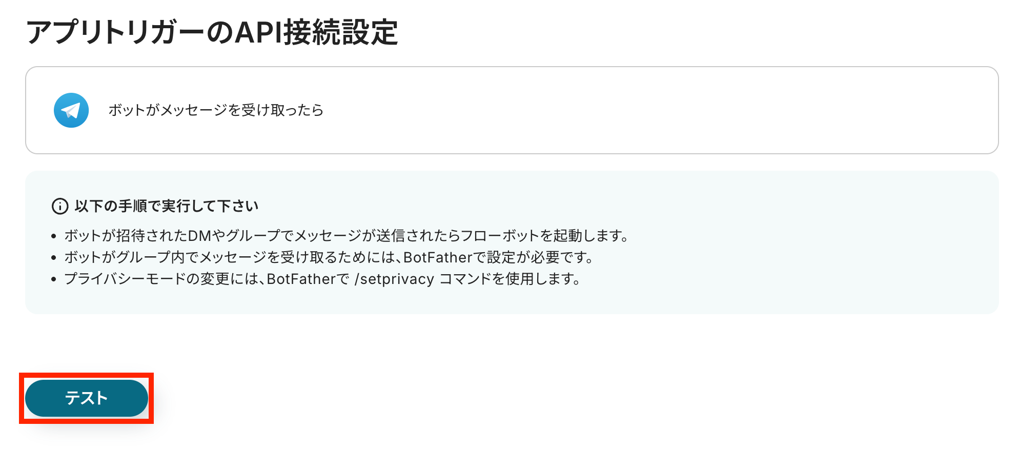 TelegramとのAPI接続が正しく行われるかの確認テストを行います。