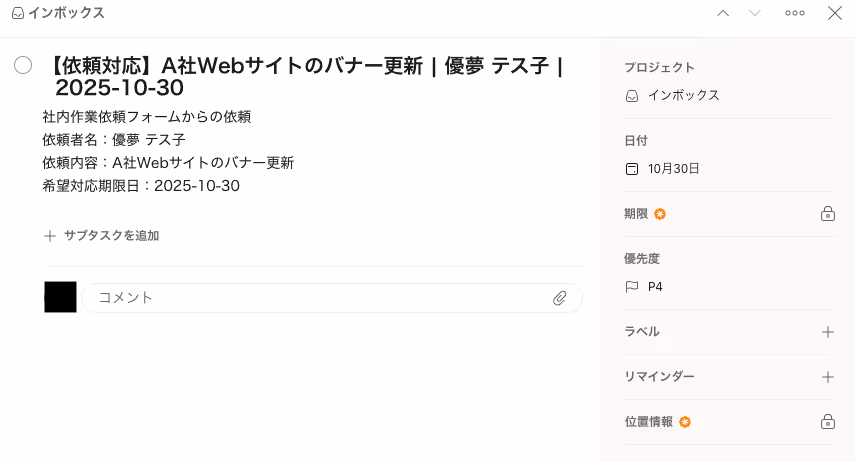 以下のように、フォームの回答内容をもとに、タスクが作成されていれば成功です!