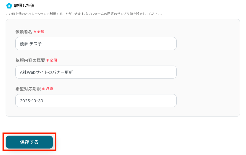 取得した値にテスト用の回答を入力したら、保存して次のステップへ進みましょう!