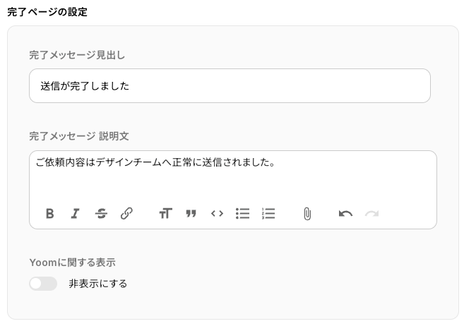 フォームが作成できたら、フォーム送信後に表示される完了ページの内容を設定します。
