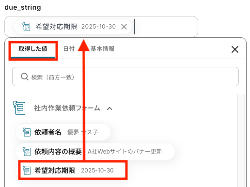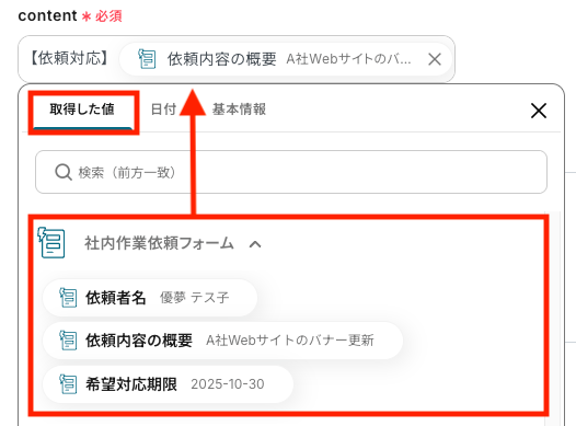 このような事態を防ぐには、ステップ3で取得した値を変数として使用し、内容が動的に変わるよう設定するのがおすすめです。