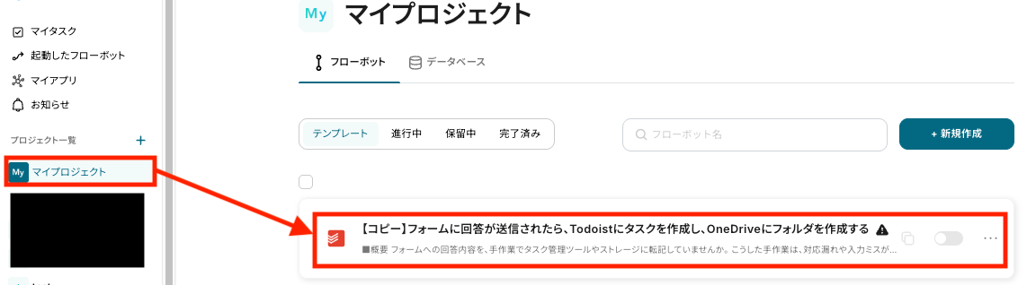 マイプロジェクトから「【コピー】フォームに回答が送信されたら、Todoistにタスクを作成し、OneDriveにフォルダを作成する」を選んでください。