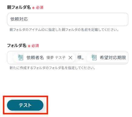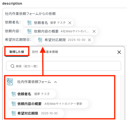 今回は、固定の文字列とステップ3で取得したデータを組み合わせて、「【依頼対応】{依頼内容の概要} | {依頼者名} | {希望対応期限}」という形式にしてみました!