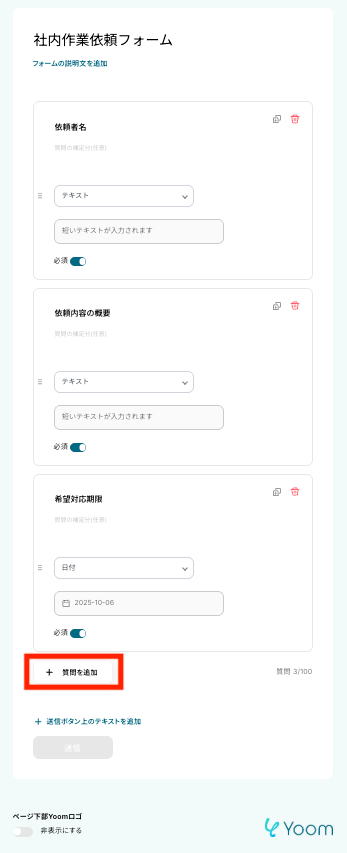 質問項目を増やしたい場合は、フォーム下部にある「+質問を追加」をクリックしましょう。