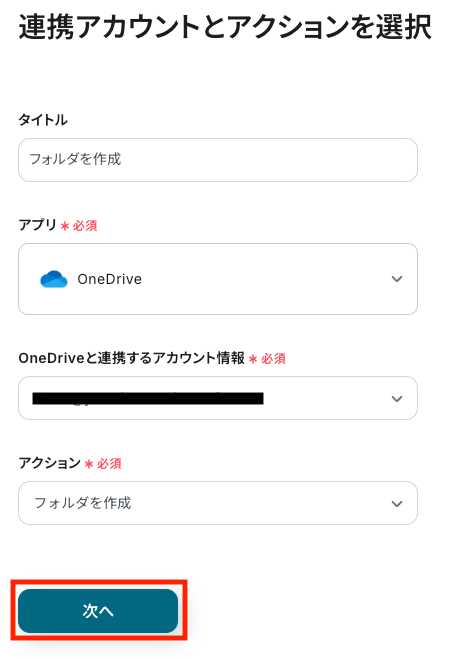 アカウント情報には、ステップ1でマイアプリ連携を行ったアカウントが自動で入力されています。