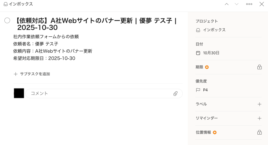 例えば、「デザイン修正依頼」といった固定の文字列のみを設定した場合、毎回同じ名前でタスクが作成されてしまい、個別のタスクを判別しづらくなります。