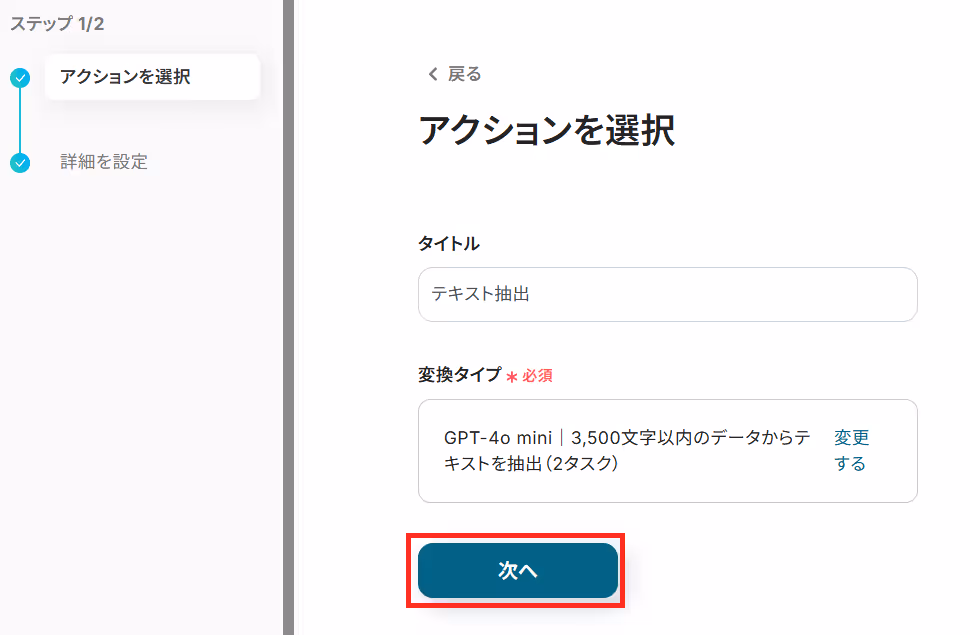 AIが情報を抽出する「対象のテキスト」を、取得した値の中から設定します。