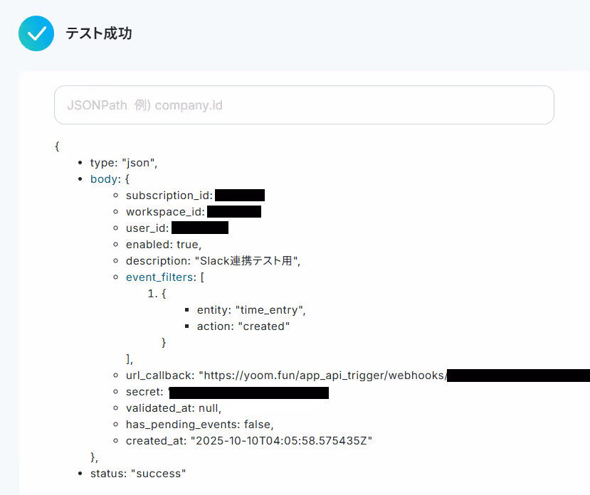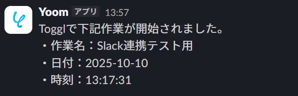 これでTogglに新しいTime Entryが作成されたことをYoomで検知したら、自動でタイマーの内容をSlackに通知するようになりました。