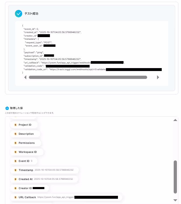 Togglで新しくTime Entryが作成されたことをYoomで検知したら、後続オペレーションに連携させるために必要な詳細情報を取得していきます。