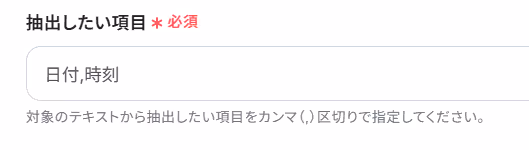 次に、対象のテキストから抽出したい項目を、カンマ区切りで入力してください。