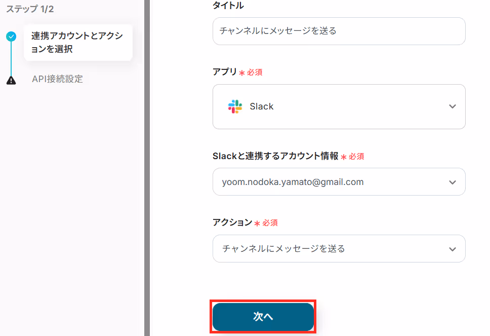 タイトルを任意で設定し、Slackと連携するアカウントやアクション内容を確認したら「次へ」を押してください。