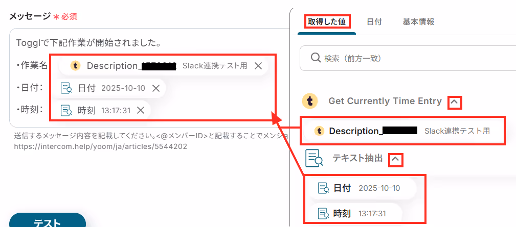 メッセージ内容を設定できたら、「テスト」ボタンをクリックして、Slackに通知を送信できるか確認してみましょう。